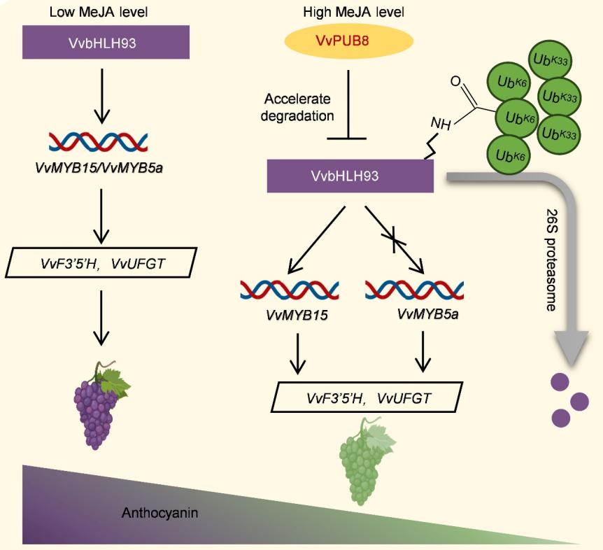 近日,JIPB在线发表了来自西北农林科技大学房玉林/鞠延仑团队题为“The VvPUB8-VvbHLH93-VvMYB15/VvMYB5a module inhibits the synthesis of anthocyanins in grape in response to the MeJA”的研究论文。文章揭示了在高浓度茉莉酸甲酯条件下,VvPUB8通过K6-和K33-泛素链泛素化修饰VvbHLH93,并加速VvbHLH93蛋白的降解,抑制花色苷合成相关基因的表达,从而抑制葡萄花色苷合成的分子机制(图1)。