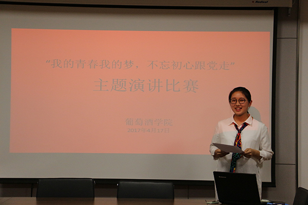 为迎接党的十九大,引导广大青年牢固树立政治意识、大局意识、核心意识、看齐意识作为灵魂和方向,学习党的精神。4月17日晚七点半,由葡萄酒学院团工委主办的以“我的青春我的梦,不忘初心跟党走”的演讲比赛在食品学院六楼创新会议室举行。葡萄酒学院团工委书记赵星宇老师,16级辅导员李雅男老师,学生会主席吴亚东学长,宣传部副部陈晨学姐参与观看本次演讲比赛并担当评委。